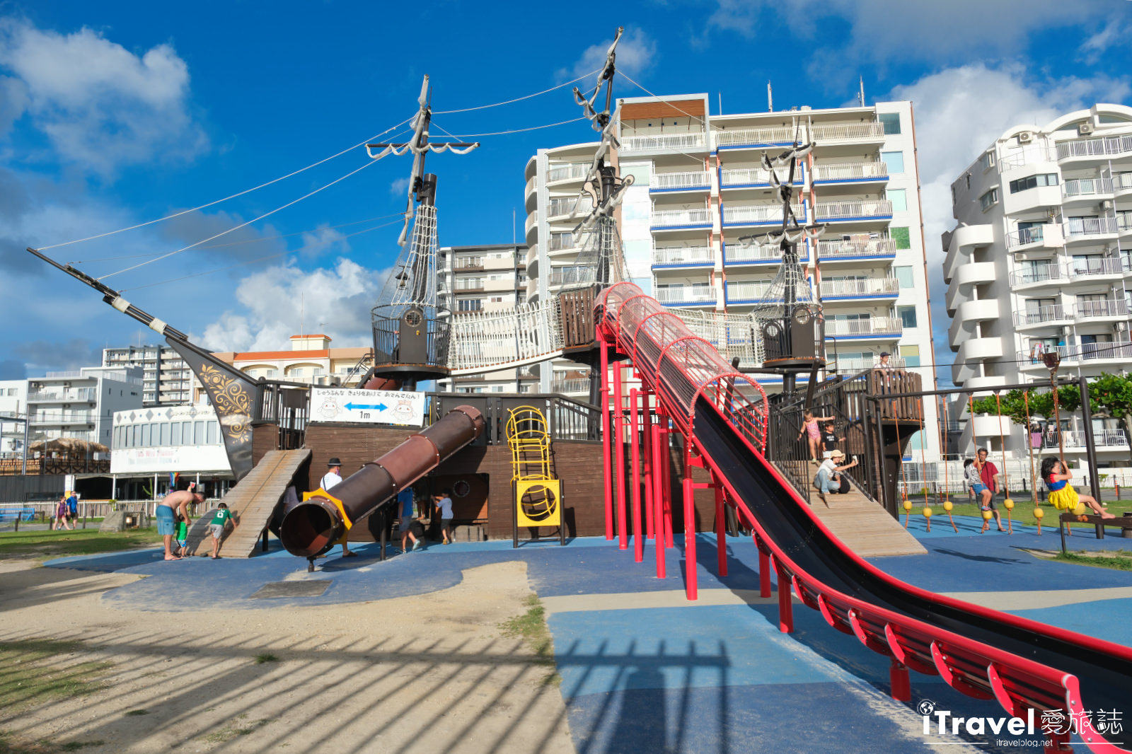 安良波公園也因這艘造型吸睛的海盜船遊具,而成為沖繩本島最受歡迎的親子景點之一。這座仿造古代帆船打造的大型遊具,設計融合滑梯、攀爬架、鑽洞隧道等多樣化設施,讓孩子們宛如進入冒險故事書的世界。不只小孩玩得盡興,周邊還有大片草地,非常適合野餐、玩球或讓孩子自由奔跑,是親子共度悠閒午後的理想場所。